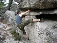 - Mouvement de bloc. Le grimpeur s'élance du sol, en courant puis sautant sur des prises de pied, puis réalise un jeté pour atteindre les premières prises de main situées très haut[7].