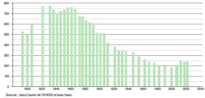 L'évolution du nombre d'habitants est connue à travers les recensements de la population effectués dans la commune depuis 1793. Pour les communes de moins de 10 000 habitants, une enquête de recensement portant sur toute la population est réalisée tous les cinq ans, les populations légales des années intermédiaires étant quant à elles estimées par interpolation ou extrapolation[31]. Pour la commune, le premier recensement exhaustif entrant dans le cadre du nouveau dispositif a été réalisé en 2007[32].