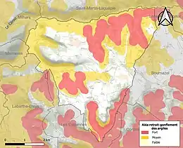 La commune est vulnérable au risque de mouvements de terrains constitué principalement du retrait-gonflement des sols argileux[24]. Cet aléa est susceptible d'engendrer des dommages importants aux bâtiments en cas d’alternance de périodes de sécheresse et de pluie. 60,3 % de la superficie communale est en aléa moyen ou fort (76,3 % au niveau départemental et 48,5 % au niveau national). Sur les 160 bâtiments dénombrés sur la commune en 2019, 37 sont en aléa moyen ou fort, soit 23 %, à comparer aux 90 % au niveau départemental et 54 % au niveau national. Une cartographie de l'exposition du territoire national au retrait gonflement des sols argileux est disponible sur le site du BRGM[25],[Carte 3].