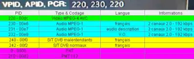 En bleu ciel on trouve l'ensemble des flux audio associé le codage et la langue: Français, audiodescription, ou version originale, sur l'adaptateur TNT la langue française est sélectionnée: le PID audio (APID) est 230.