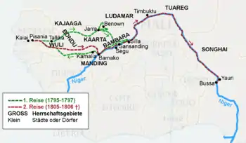Mungo Park propose de reprendre les explorations de Houghton et part le pour la Gambie. Le , il atteint l'embouchure de la Gambie et il remonte le fleuve jusqu'au comptoir de Pisania[3]. Il apprend le dialecte local grâce au médecin du comptoir et commence son périple dans les terres en . Il traverse le lit du Sénégal, visite le Moullé, le Bondou, le Kaarta et est arrêté par les Maures et fait prisonnier pendant quatre mois par leur chef Ali qui le traite en esclave. Il arrive à s'échapper dans le désert seul sans presque rien à boire et à manger. Après trois semaines de souffrances, il atteint la ville de Ségou, où il peut enfin voir le Niger. Il remonte le fleuve sur 110 km mais, épuisé et malade, décide de rejoindre Ségou. Averti par des indigènes, il apprend que la ville est tombée aux mains de son ancien geôlier. Il décide alors de rallier la ville de Kamalia. La saison des pluies ayant commencé, le voyage est alors encore plus pénible que dans le désert. Il arrive épuisé à Kamalia et reste plusieurs jours entre la vie et la mort. Remis sur pied, il décide de se joindre à une caravane d'esclaves qui rejoint la côte. Six mois plus tard, de retour au Royaume-Uni, il publie le récit de son voyage.