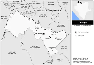 La municipalité d'Ocampo compte 120 localités dont les principales sont (avec la population de 2010 entre parenthèses) :