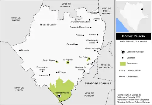 - Instituto Nacional de Estadística y Geografía, « Prontuario de información geográfica municipal de los Estados Unidos Mexicanos: Gómez Palacio, Durango », (consulté le )