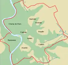 La première muraille de Rome qui ne protège que le mont Palatin de forme carrée remonte à la fondation de la ville à l'époque de Romulus[B 1]. Elle se dénomme Roma quadrata et aurait comporté trois ou quatre portes[B 2]. Des doutes subsistent encore sur son existence malgré la découverte de vestiges au nord-est de ce mont[B 3].
