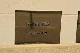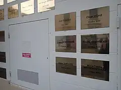 Les plaques des récipiendaires du Prix Lumière[3] sont regroupées sur la partie gauche du mur. Elles indiquent uniquement l'année du prix, pas les dates des anciens passages éventuels.