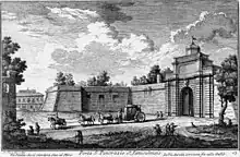 La Porta Portese remplace la Porta Portuensis, perpendiculaire au Tibre, située à quelques centaines de mètres d'elle plus en aval le long de la Via Portuensis, ainsi que la partie attenante du mur d'Aurélien dont elle réutilise les matériaux de démolition pour sa construction. Les travaux commencent en 1643[12]. Proche du port de Rome, la Porta Portese en a pris l'appellation[13]. Géolocalisation : 41,8799, 12,4739.