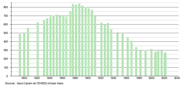 L'évolution du nombre d'habitants est connue à travers les recensements de la population effectués dans la commune depuis 1793. Pour les communes de moins de 10 000 habitants, une enquête de recensement portant sur toute la population est réalisée tous les cinq ans, les populations légales des années intermédiaires étant quant à elles estimées par interpolation ou extrapolation[16]. Pour la commune, le premier recensement exhaustif entrant dans le cadre du nouveau dispositif a été réalisé en 2005[17].