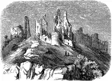 - Le château (ruines) fait l’objet d’une inscription au titre des monuments historiques depuis le [20]. Il en subsiste une enceinte quadrangulaire de 90 × 100 m en partie du XIIe siècle ?, flanquée de tours rondes et d'un gros donjon circulaire au XIIIe siècle. Il est remanié au XIVe siècle, pris et ruiné en 1465 par Louis XI et démantelé après la trahison du connétable de Bourbon en 1523[21].