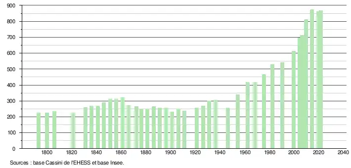 L'évolution du nombre d'habitants est connue à travers les recensements de la population effectués dans la commune depuis 1793. Pour les communes de moins de 10 000 habitants, une enquête de recensement portant sur toute la population est réalisée tous les cinq ans, les populations légales des années intermédiaires étant quant à elles estimées par interpolation ou extrapolation[19]. Pour la commune, le premier recensement exhaustif entrant dans le cadre du nouveau dispositif a été réalisé en 2004[20].