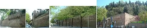 Aujourd’hui la muraille, intacte sur un peu moins de la moitié de son tracé, comporte encore ses tours d’origine (malheureusement modernisées ou retapées selon un style un peu trop moderne) et interrompue à deux endroits pour permettre l’accès routier à la cité et l’entrée au parc voisin du théâtre Bonci.