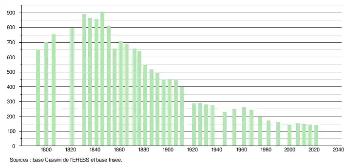 L'évolution du nombre d'habitants est connue à travers les recensements de la population effectués dans la commune depuis 1793. Pour les communes de moins de 10 000 habitants, une enquête de recensement portant sur toute la population est réalisée tous les cinq ans, les populations légales des années intermédiaires étant quant à elles estimées par interpolation ou extrapolation[15]. Pour la commune, le premier recensement exhaustif entrant dans le cadre du nouveau dispositif a été réalisé en 2006[16].