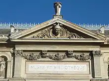 L'ornementation de la façade du monument a été particulièrement bien travaillée, elle est traitée en symétrie et rassemble tous les éléments à usage allégorique. Quatre colonnes corinthiennes encadrent les trois baies vitrées, le tout entouré de pilastres. La répartition des ouvertures obéit à une logique de composition et de formalisme et non à celle de l'éclairement ou de l'aération. En regardant la façade, collée au fronton, une tête de Minerve. En dessous, à gauche, les sculptures de style Renaissance des trois muses de la peinture (sculptée par Roland Mathieu-Meusnier), de l'architecture (sculptée par Auguste Ottin) et de la sculpture (sculptée par Hélène Bertaux). À droite celles de la poésie (sculptée par Ferdinand Taluet), de la science (sculptée par Louis Auguste Roubaud[19]) et de l'histoire (sculptée par Henri Michel Antoine Chapu). En dessous, six médaillons d'hommes illustres, Jean Goujon, Corneille, Descartes, Pierre Lescot, Lesueur, Montesquieu, encadrés par des allégories. Celles de l'Inspiration et de la Nature côté musée, et celles de l'Étude et de la Méditation côté bibliothèque. À droite et à gauche de la porte d'entrée deux candélabres s'inspirent de ceux d'époque romaine conservés au musée du Louvre.