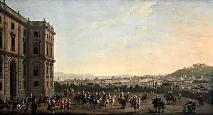 En 1738, le roi décide d'ériger un pavillon de chasse (casino di caccia) sur la colline de Capodimonte, au nord de sa capitale. Très vite, il s'oriente finalement vers la construction d'un véritable palais, la Reggia di Capodimonte, d'après les plans d’Antonio Canevari et de Giovanni Antonio Medrano, l'architecte du Teatro San Carlo de Naples, destiné à servir de musée[7]. Parallèlement, une équipe d'experts définit les espaces intérieurs pour aménager la collection ; le projet prévoit que les œuvres seront conservées dans les salles exposées au sud, sur la mer[8]. Dès l'origine, Capodimonte a donc une vocation muséale.