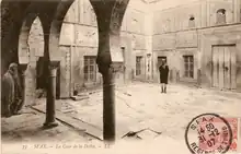 Derrière une façade simple, dans le pur style classique des demeures traditionnelles tunisiennes, se trouve une cour carrée, dallée de marbre blanc et aux parois revêtues de céramique bleue à mi-hauteur[4]. Les pièces d'habitation en forme de « T » renversé s'ordonnent sur chacun des côtés. Avec le « salon » qui fait face à la porte d'entrée, les maqsoura (arabe : مقصورة)[5] qui servent autant de chambres à provision que de débarras et les extrémités de la partie principale aménagées en alcôves pour accueillir des lits, ces pièces sont autant d'appartements habités généralement par la membres de la famille propriétaire de la demeure. Les portes sont encadrées de stuc sculpté[4]. Les deux étages supérieurs disposent de déambulatoires et de balustrades en bois[4].