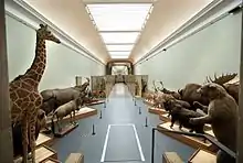 La plus importante en termes de surface et d'animaux exposés, cette exposition présente de manière systématique les principaux groupes d'animaux vertébrés. Plusieurs pièces sont rares, comme le requin blanc, le plus grand spécimen naturalisé visible au monde, l'ours blanc, l'orignal, la girafe ou le buffle.