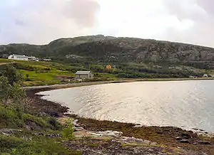 Bâtiment du musée d'Alta (en haut à gauche). Les gravures rupestres du patrimoine mondial se trouvent en diverses localisations entre le bâtiment et les rives de l'Altafjord