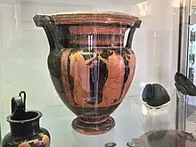 Cratère attique à figures rouges : Ce cratère est daté du première moitié du Ve siècle av. J.-C. On y voit quatre personnages : le dieu Dionysos préside les vendanges. Il est représenté debout, tenant un thyrse. Il est le seul à être habillé. Son attitude noble contraste avec les satyres, indécents et burlesques. Un des satyres porte une hotte de raisin. Il louche et parait hilare. Un autre satyre foule les raisins dans une corbeille.