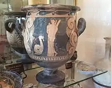 Cratère attique à colonnettes : Dionysos est représenté tenant un thyrse. La figure du dieu, majestueuse, s'impose au centre. Il est représenté dans la force de l'âge, avec une barbe et une chevelure abondantes. Il est entouré de deux ménades.