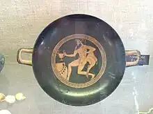 Kylix à figures rouges : Le satyre se dirige en courant vers un grand cratère. Il tient à sa main un canthare, un vase destiné à boire le vin. Il porte également une outre sur son épaule. Le satyre est l'une des figures emblématiques du cortège du dieu Dionysos.