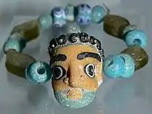 Collier carthaginois en pâte de verre : Le pendentif est peut-être à rapprocher du Dieu égyptien Bès, protecteur du foyer. Sa laideur permettrait d'éloigner le mauvais œil. Il est daté du IVe siècle av. notre ère[3].