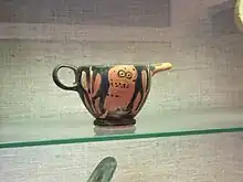 Skyphos à la chouette : Le skyphos est un vase à boire. Celui-ci est daté du Ve siècle av. J.-C. Un rameau d'olivier se trouve de chaque côté de la chouette, qui est l'un des attributs de la déesse Athéna, protectrice d'Athènes.