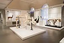 L'une des salles du musée Kosmos avec un squelette de rhinocéros blanc du sud au premier plan. - Requin taupe bleu (Isurus oxyrhynchus) du détroit de Messine, acheté par l'abbé Gaetano Grano en 1790.