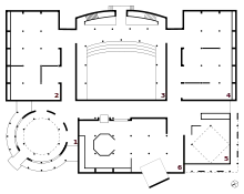 Légende : 1. Rotonde d'entrée ; 2. Salle d'exposition « Géologie et Protohistoire » ; 3. Patio et toit panoramique ; 4. Salle d'exposition « Marbre » ; 5. Salle d'exposition « Colonie romaine » ; 6. : Espace d'information et salle de lecture.