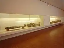 Trois salles situées sous le hall d’entrée, au niveau −1, sont consacrées aux antiquités. Deux salles pour les antiquités égyptiennes, avec en particulier de très beaux cartonnages et cercueils et la troisième consacrée aux antiquités grecques et romaines, comprend un fonds de céramiques grecques et étrusques ainsi que de la statuaire. La moitié des pièces de cette dernière salle provenant de la collection du marquis de Campana acquise par Napoléon III en 1861 puis mise en dépôt dans plusieurs musées français[191]. On y remarque une stèle funéraire attique de grande dimension provenant d'Athènes ou de Salamine représentant deux personnages en haut-relief, et rapportée à Grenoble en 1779 par un officier de marine, le comte Joseph de Flotte (en). Dix ans plus tard, il fait don de cette stèle, datant du Ier siècle avant notre ère, à la bibliothèque municipale de Grenoble avant qu'elle ne rentre plus tard dans les collections du musée[191].