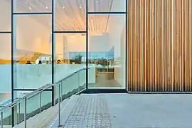 Le bâtiment s'ouvre vers l'extérieur avec de fenêtres disposées de façon aléatoire, et est recouvert de mélèze[6].