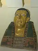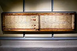 Le mobilier égyptologique comporte également un masque funéraire, vestige d'un sarcophage, daté de la XXe dynastie et mesurant 28,5 × 26,5 cm[101] ; le sarcophage d'un personnage nommé Idi (de) — un officier de marine d'Assiout également appelé Jdjj —, pièce datée de la XXe dynastie, mesurant 200 × 48 × 52 cm et dont le couvercle est orné d'un nocturlabe[102],[103],[104] ; le fragment d'une « baguette » apotropaïque (baguette de naissance), un objet fabriqué dans de la corne d'éléphant portant des inscriptions sur chaque côté et qui mesure 11 cm de long pour 5,8 cm de diamètre[105] ; une figurine représentant un babouin tenant un Œil oudjat, conçue en faïence et mesurant 4,5 cm de haut[106] ; un sarcophage confectionné en bois polis dont les dimensions externes et internes sont respectivement de 195 × 70 × 47 cm et 175 × 50 × 30 cm, pièce attribuable à la fin de la XXVe/début de la XXVIe dynastie — sur la surface externe du cercueil figure un texte évoquant le jugement de l'âme et au sein duquel les divinités Thot, Rê-Horakhty, Osiris, Isis, Nephtys et Anubis sont mentionnées —[107],[108] ; un siège en bois daté du Nouvel Empire et mesurant 21 cm de haut pour 34 cm de long et 24 cm de large[109] ; la statue d'un faucon faite en bronze dont la tète est surmontée d'une double couronne pharaonique, une pièce datée entre 664 et 332 ans av. J.-C. mesurant 7,3 × 5,7 × 0,8 cm pour une hauteur de 23,5 cm[110],[111] ; une stèle consacrée au dieu Henou mesurant 5 × 26 × 41cm[112],[113] ; et la statue d'un ibis, une sculpture confectionnée en bronze, de 6 cm de haut pour 9 cm de long et datée des VIIe – IVe siècle av. J.-C.[114],[115].
