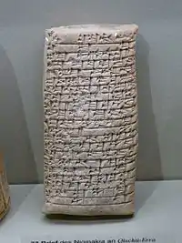 La collection levantine comprend un fragment de dédicace faite par un architecte pour un souverain et gravée sur une brique faite en adobe[119] ; une inscription de 3,6 × 3,6 × 1,7 cm et d'un poids d'environ 500 g gravée sous la dynastie de Puzur-Mama (en) (époque sumérienne et datée d'environ 2 300 av. J.-C.)[120],[Note 3] ; une inscription de 1,6 × 5,8 × 5,3 cm datée d'environ 3 000 av. J.-C. (époque d'Uruk III) et mise en évidence sur le site de Warka[124].