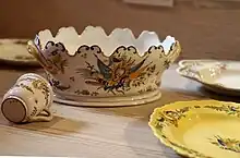 - Un porte-montre daté de 1760 environ en faïence stannifère à décor de grand feu polychrome. L'orifice central destiné à recevoir la montre est entouré d'ornements montrant de part et d'autre un homme (la mort) et une femme (le temps qui passe)[M 1].