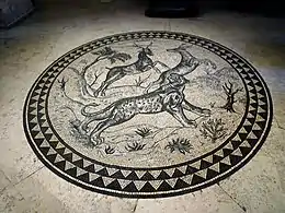La salle 1 est aménagée dans la tour ouest[4]. Au sol, une mosaïque tricolore réalisée entre 1940 et 1943 représentant un tigre attaquant deux cerfs placés dans un environnement fleuri et boisé[4]. La salle comprend des moyens vidéo et une projection.
