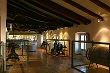 - Tour mécanique. Tour mécanique qui effectuait un mouvement de rotation sur une pièce de bois, laquelle s'arrondissait à l'aide d'un outil tranchant. Ce tour a été fabriqué à la tournerie Can Casadesús d'Arbúcies, fondée en 1898 et qui fabriquait des pièces pour l'industrie textile. Le tour a été monté avec des transmissions (courroies et poulies) originales, qui peuvent être activées et mises en service[13].