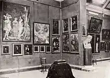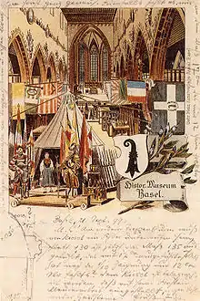 Dès le début, les responsables du musée assignent une mission nationale aux collections, voulant exercer une « influence bénéfique et salutaire sur toute la patrie »[15]. La « Galerie nationale secrète »[16] s’agrandit essentiellement par l’achat d’œuvres d’art suisses. Lorsque les négociations pour la fondation d’un musée national commencent en 1883, le canton de Bâle-Ville s’engage logiquement pour en devenir le lieu d’implantation et propose comme fond principal ses collections d’histoire culturelle, rassemblées par la ville pour déposer son dossier de candidature. Le Musée national suisse (Schweizerisches Landesmuseum) s’installe à Zurich, mais un musée historique (non plus national mais bâlois) est créé dans un bâtiment historique, l’ancienne église gothique Barfüsserkirche. L’aménagement du musée historique était une « démonstration flagrante du talent et du sens artistique bâlois, un mélange entre parcours éducatif et enfilade d’étals »[17]. Il faut également considérer la récente nationalisation du Musée des arts et métiers (Gewerbemuseum), vitrine de la production contemporaine, comme une expression de la fierté bourgeoise et un sens corporatif nouvellement découvert dans le cadre duquel elle considère ses valeurs et sa productivité comme le fondement de l’État et de la société.