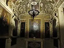 L'escalier permet de rejoindre directement l'Appartement des Conservateurs composé de 9 pièces constituant les salles de représentation des Conservateurs. Cet «Appartement» était étroitement lié à la fonction exercée par les Conservateurs qui, avec le Prieur du Capo Rioni, constituaient les trois Magistrats romains à partir de 1305[25]. Ces pièces sont richement décorées: fresques, stucs, plafonds, portes, tapisseries… Cette partie est la plus ancienne du palais, avec encore des fresques du XVIe siècle.