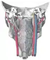 - Insertion ventrale : Son chef supérieur s'attache sur la grande aile de l'os sphénoïde sous la crête infratemporale et son chef inférieur prend lui son insertion sur la face latérale du processus ptérygoïde de ce même os.