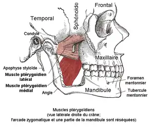 Il est élévateur de la mandibule, participe à la propulsion de la mandibule (contraction bilatérale) et participe aussi au mouvement de diduction controlatérale (contraction unilatérale). En cas de contracture des trois puissants muscles élévateurs, il est impossible d'ouvrir la bouche (trismus).