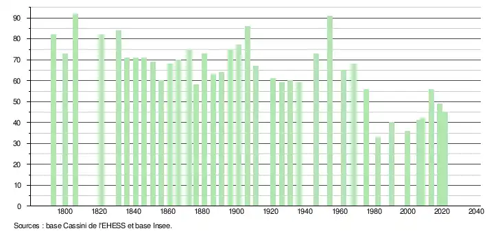 L'évolution du nombre d'habitants est connue à travers les recensements de la population effectués dans la commune depuis 1793. Pour les communes de moins de 10 000 habitants, une enquête de recensement portant sur toute la population est réalisée tous les cinq ans, les populations légales des années intermédiaires étant quant à elles estimées par interpolation ou extrapolation[24]. Pour la commune, le premier recensement exhaustif entrant dans le cadre du nouveau dispositif a été réalisé en 2008[25].