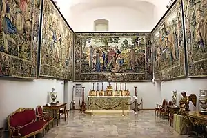 10 tapisseries flamandes en laine, fils de soie polychromes, or, argent sont conservées dans le musée. Neuf d'entre eux ont été tissées entre 1620 et 1624 à Bruxelles par Hendrik Mattens[5] d'après des cartons de Raphaël représentant des épisodes du Nouveau Testament ; les quatre vertus cardinales apparaissent dans les bords et les trois vertus théologiques dans la base. Elles ont été données au Sanctuaire par le noble génois Giovanni Battista di Niccolò Pallavicino en 1667.