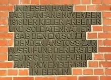 Le , la ville de Kiel a organisé la première marche commémorative des insurrections[5]. Le , la place de la gare a été rebaptisée « place des marins de Kiel » (Platz der Kieler Matrosen) en hommage aux mutineries de [6].