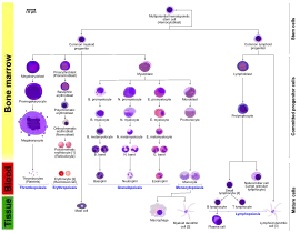 La granulopoïèse est constituée de cinq étapes, dont le myéloblaste est la première cellule reconnaissable. Ce dernier se différencie ensuite en monoblaste ou en promyélocyte, qui se divise ensuite en l'un des trois types de myélocytes, basophile, neutrophile ou éosinophile.