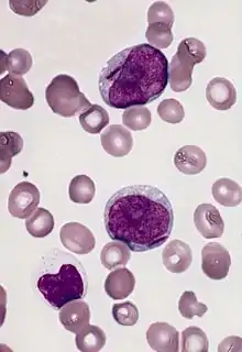 On différencie les myéloblastes des lymphoblastes grâce à la présence de granules dans le cytoplasme des lymphoblastes et de chromatine plus condensée[4].