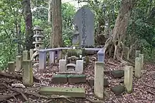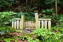 Plus loin se trouve la cloche du temple et les cénotaphes du prince Morinaga et de son épouse[5]. La plaque à côté du cénotaphe du prince Morinaga (en japonais) se lit comme suit :