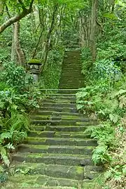 La porte niō derrière conduit à un escalier moussu de 50 marches qui, aujourd'hui, est le principal titre de[Quoi ?] du temple et qui a gagné le surnom mentionné ci-dessus de Kokedera. Au bas de l'escalier se trouvent deux grottes dont l'une accueille une statue de Nichiren tandis que l'autre est un mausolée pour la plupart des prêtres qui ont vécu ici[5]. Au-dessus de l'escalier moussu se trouve un troisième bâtiment appelé Hokkedō ou Salle des Écritures[5].