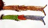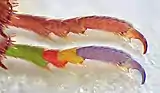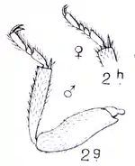 | À gauche : en haut : tarse du antérieur de la femelle (♀), en bas : patte antérieure du mâle (♂), À droite : en haut : tarse du antérieur de la femelle (♀), en bas : tarse antérieur du mâle (♂) (photos avec copies colorisées). | |