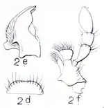 | Pièces buccales : d) Labre supérieur, e) Mâchoire supérieure f) Mâchoire inférieure avec palpe maxillaire. | |
