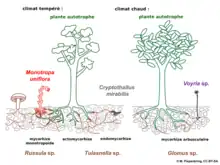 Le mycohétérotrophe ne peut exercer la photosynthèse (capacité photosynthétique nulle ou réduite) en raison de l'absence de chlorophylle et de sa vie dans des conditions de faible luminosité. Ces plantes hétérotrophes vont puiser le carbone grâce au complexe ectomycorhizien formé par l'association entre des champignons et des arbres voisins. La mycohétérotrophie est parfois considérée comme une relation de parasitisme et les mycohétérotrophes sont parfois désignés de façon informelle comme des « exploiteurs de mycorhizes ». Cette relation est parfois appelée « mycotrophie », bien que ce terme soit aussi utilisé pour des plantes engagées dans une relation de mutualisme avec les mycorhizes. Les termes d’« épi-parasites » ou de plantes « tricheuses » sont aussi parfois employés pour désigner ces organismes. Les « exploiteurs de mycorhizes » obtiennent a priori un bénéfice sans réciprocité mais il est possible qu'ils produisent de la vitamine B, ou qu'ils aient un effet protecteur sur les champignons[1],[2].