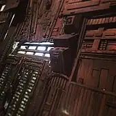 Trois immenses cercles lumineux, placés au centre de la salle et évoquant une soucoupe volante[18], éclairent la foule d'une lumière rouge, tandis que des alarmes retentissent. Des cubes-écrans grésillent au-dessus du public, dévoilant des visages en noir et blanc[21]. Alors que les alarmes cessent, la salle est plongée sous une lumière bleue.