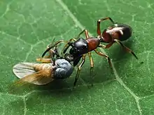 Les fourmis mimées sont des espèces du genre Myrmica comme Myrmica rubra[2] et Myrmica scabrinodis[6] ou d'espèces du genre Formica telles Formica rufibarbis[7].